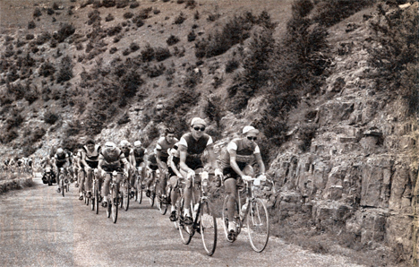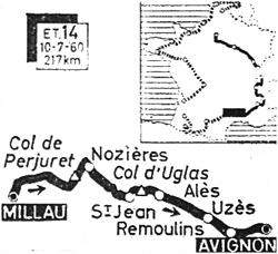 - Viot et Falaschi en profitent pour s'échapper et Groussard les rejoint. Viot se relève mais les deux autres attaquent la (aide) montée du Col d'Uglas (km 120) devant une foule très dense. Graczyk et Beuffeuil se lancent à la poursuite des fuyards. Le regroupement se réalise près du sommet et Beuffeuil attaque tout de suite passant le col avec 15" d'avance sur ses compagnons (km 126). Derrière le peloton s'est rapproché. Adriaensens s'en est détaché de 20". Dans la descente, tout se regroupe et une sur une belle route, une soixantaine d'hommes passe Alès et se dirige calmement vers l'arrivée. On apprend encore la chute et l'abandon de Thiélin. Après Uzès (km178), le peloton "maillot jaune" reste compact. Une attaque de Pauwels et de 11 coureurs échoue et à 30 bornes du but, rien n'est fait.