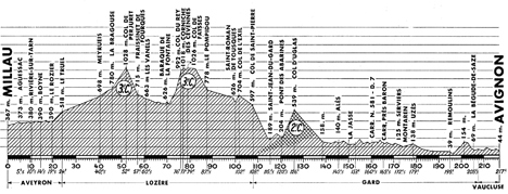 10h30 (Aveyron) : Millau (km 0) - N9 Aguessac (km 5.5) - N107bis Rivière-sur-Tarn (km 10.5) - Boyne (près de) (km 14.5) - (Lozère) : Le Rozier (km 19.5) - N596 Le Truel (km 24) - Meyrueis (km 40.5-CV) - Col de Perjuret (km 52-GPM3) - Fraissinet-de-Fourques (km 57) - Les Vanels (km 60.5) - Vebron (km 62.5) - Salgas-Racoulès (km 64.5) - Baraque de la Fontaine (km 70) - N583 Saint-Laurent-de-Trêves (km 74) - Nozières (km 75) - Col de Rey (km 76) - D9 Corniche des Cévennes (km 77-GPM3) - Col de Faysses (km 79) - Le Pompidou (km 87.5) - Le Castanier (km 95) - Saint-Roman de Tousques (km 100) - Col de l'Exil (km 102) - Col de Saint-Pierre (km 108) - (Gard) : N107 (km 113) - Saint-Jean du Gard (km 115.5-ravitaillement) - D50 Pont des Abarines (km 120.5) - D160 Col d'Uglas (km 126-GPM2) - Saint-Paul Lacoste (km 129) - La Baume (km 139) - N107B Cendras-la-Blaquière (km 140.5) - Alès (km 145.5-CV) - N581 La Jasse (km 150) - Baron (près de) (km 165.5) - Foissac (près de) (km 167.5) - Serviers (km 172.5) - Montaren (km 174.5) - Uzès (km 178.5-CV) - Vers (près de) (km 188.5) - D19 (km 191.5) - Remoulins (km 194.5) - N100 (km 202.5) - La Begude-de-Saze (km 205) - La Begude-de-Rochefort (km 205) - (Vaucluse) : Avignon/Allées de Verdun (km 217).