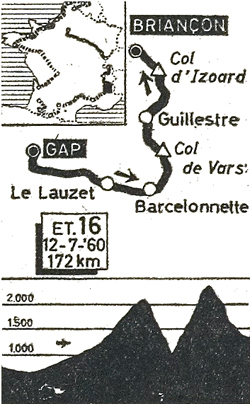 - Dans l'ascension du col de l'Izoard, la sélection se fait par l'arrière et à 8 km du sommet, il reste un groupe d'environ 25 hommes à l'avant mais il va encore perdre en cours de route : Darrigade, Graczyk, Pauwels, Simpson, Mahé, Suarez, Lorono, Anglade, Sutto, Geldermans, Rostollan tandis que Gimmi fait l'élastique. A La Casse Déserte, le groupe des leaders ne compte plus que 13 coureurs. Gimmi décroche et à 2 km du sommet, nous trouvons : Mastrotto, Pavard, Delberghe, Nencini, Massignan, Pambianco, Battistini, Adriaensens, Planckaert, Robinson, Junkermann & Rohrbach. Mastrotto, Delberghe et Adriaensens perdent pied au moment où les Italiens attaquent. Massignan et Battistini filent vers la banderole du grimpeur. Aux 1000 mètres, ils ont 10" d'avance. Les derniers hectomètres sont noirs de monde. Au col (km 148), Massignan passe premier avec deux longueurs sur Battistini, à 20" Rohrbach et Robinson, à 25" Pambianco, Junkermann, Pavard, Planckaert & Nencini, à 40" Delberghe, à 45" Adriaensens, à 50' Mastrotto etc.