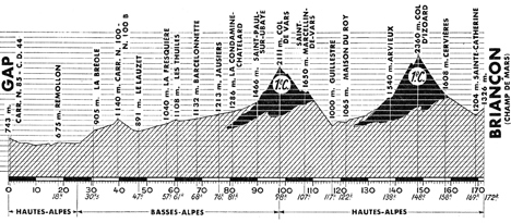 11h25 (Hautes-Alpes) : Gap/Av. J. Jaurès (km 0) - N85 - D44 (km 3.5) - N542 (km 10) - Remollon (km 18) - Espinasses (près de) (km 24) - (Basses-Alpes) : La Bréole (près de) (km 30.5) - N100 Le Lauzet (km 47) - La Fresquière Méolans (km 56) - Les Thuiles (km 61) - Barcelonnette (km 68-CV) - Jausiers (km 76) - La Condamine-Châtelard (km 81) - N202 Saint-Paul-sur-Ubaye (km 90) - Col de Vars (km 98-GPM1) - (Hautes-Alpes) : Vars Saint-Marcellin (km 107) - Guillestre (km 117-ravitaillement) - Maison du Roy (km 122) - Arvieux (km 138) - Brunissard (km 140) - Col de l'Izoard (km 148-GPM1) - Cervières (km 158) - Briançon-Sainte-Catherine (km 169) - Briançon/Champ de Mars (km 172).