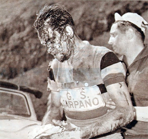 - Van Geneugden chute lourdement mais repart la tête ensanglantée. A Cluses (km 138.5), où l'Espagnol passe 8'15" avant Milesi et 17'40" sur le maillot jaune, les coureurs se ravitaillent pour la 2ème fois. A Thaninges (km 148) il est à 17', 16' à Prévières (km 164), 14'45" à Pont-Morand (km 172), 14' à Boëge (km 178) où Milesi n'a plus que 3' d'avance sur le peloton. Au col de Terramont (km 189.5), l'Espagnol passe 13' avant Milesi et 15' avant le peloton. A un peu plus de 25 kilomètres, sauf accident la victoire est promise à Manzaneque.