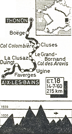 - Au col des Aravis (km 96), devant une foule énorme, la situation est la suivante : Manzaneque en tête, à 5'15" Milesi, à 11'30" Bisilliat, à 17'50" Massignan, à 18'00" Marigil et Rohrbach, à 18'05" Queheille et le peloton en file indienne. Le leader arrive au Grand-Bornand (km 109), il lui reste 106 kilomètres à parcourir ! Le peloton va escalader la dernière difficulté répertoriée de ce Tour 1960 : le col de la Colombière. Bisilliat est repris à mi-col. La bataille ne se déclenche pas chez les favoris et Manzaneque passe le col en tête, loin devant Milesi et 17'50" devant Massignan qui règle un peloton d'une quarantaine d'hommes pour la 3ème place.