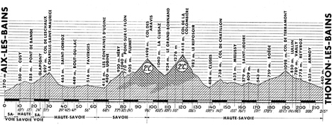 10h50 (Savoie) : Aix-les-Bains/Av. de Saint-Simond (km 0) - Grésy (km 1) - Carr. N511/D211 (km 4.5) - (Haute-Savoie) : Cusy (km 10.5) - Pont-de-Banges (km 17.5) - (Savoie) : Martinod (km 18) - La Charniaz (km 20.5) - Clapigny (km 23.5) - (Haute-Savoie) : Col de Leschaux (km 27.5) - D10 La Chapelle-Saint-Maurice (km 30) - Saint-Eustache (km 33) - D10A Saint-Jorioz (km 39) - N508 Duingt (km 42.5) - Bredannaz (km 44.5) - Bout-du-Lac (km 47) - Faverges (km 56) - (Savoie) : N212 Les Fontaines d'Ugine (km 67-ravitaillement) - D71 Ugine (km 68.5) - D109 Héry (km 77.5) - N212 Flumet (km 84.5) - N509 La Giettaz (km 90.5) - Col des Aravis (km 96-GPM2) - (Haute-Savoie) : La Clusaz (km 103.5) - Saint-Jean-de-Sixt (km 106.5) - Villaret (km 108) - Le Grand Bornand (km 109-CV) - Le Chinaillon (km 115) - Col de La Colombière (km 120-GPM2) - Pralong-Le Reposoir (km 126.5) - Miosinge (km 135) - D117 Cluses (km 138.5-ravitaillement) - Col de Châtillon (km 145) - Taninges (km 148.5) - N507 Mieussy (km 155) - Saint-Jeoire (km 161.5) - Prévières (km 163.5) - Pont Morand (km 172.5) - D20 Guiseilles (km 176.5) - Boëge (km 178.5-CV) - D22 Villard-sur-Boëge (km 181.5) - D12 Habere-Lullin (km 183.5) - Habere-Poche (km 186.5) - D22 Col de Terramont (km 189.5) - Lullin (km 194.5) - Vailly (km 196.5) - D26 Reyvroz (km 199.5) - Armoy (km 206) - Thonon-les-Bains/Bd. Jules Ferry (km 216).