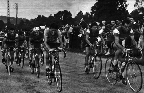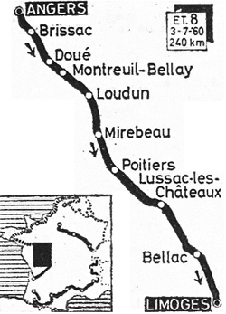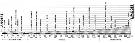 - L'entente ne règne pas au sein du groupe "Darrigade" et ils perdent du terrain : 2'10" au km 144 (peloton à 4'50"), 2'35" au 2ème ravitaillement de Lussac-les-Châteaux (km 152, peloton à 5'45"). En entrant dans la Haute-Vienne, la situation est la suivante : 3'05" de retard pour le groupe de chasse, 6'25" pour le peloton. A Bellac (km 203) : 3'25" et 8'15"... "la messe est dite". A 10 km du but, Rohrbach tente de filer, il est contré par Mahé. Aux 3000 mètres c'est Defilippis qui démarre dans la dernière côte. Battistini l'accompagne et derrière Pambianco fait barrage. Comme à Dieppe, Defilippis s'impose et le D.S. Binda jubile avec 3 de ses hommes aux 3 premières places. Le peloton "maillot jaune" est réglé par Graczyk 9'10" plus tard.