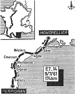En ce début d'étape, l'équipe de France est vigilante et enraye les attaques comme celle de Lefebvre (km 5). L'allure est très rapide et Rohrbach abandonne tandis que Bihouée, tombé au km 11, a du mal à suivre après son retour au km 34. Au km 76, le Britannique Laidlaw se détache avec Cazala qui le marque. Ils sont rejoints par 5 hommes au km 81 : Kersten, Marigil, Pauwels, Stablinski & Anglade puis par Hoevenaers, Abate et J. Groussard mais le peloton rapplique. Au km 85, Abate attaque, il est contré par Cazala qui marque également une tentative de P. Van Est au km 88. Les deux hommes prendront 20" d'avance avant d'être revus. Une chute intervient avant Narbonne et retarde notamment Hoevenaers et Manzaneque ainsi que quelques équipiers. D'autres tentatives après le ravitaillement (km 100) sont également matées par les tricolores notamment l'inévitable Cazala.