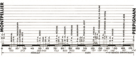 12h00 (Hérault) : Montpellier/Rte de Toulouse (km 0) - N113 Carr. N108 (km 2) - N108 Mireval (km 12.5) - Frontignan (km 20.5) - Lapeyrade (km 23.5) - Sète (km 27.5-CV) - Agde (km 50.5) - N112 Vias (km 54.5) - Villeneuve (près de) (km 66.5) - Béziers (km 72.5) - N9 Nissan-les-Enserune (km 83.5) - (Aude) : Coursan (km 92.5) - Narbonne (km 100-ravitaillement) - N9 Carr. D105 (km 105) - Prats de Cest (km 108) - Peyriac-de-Mer (près de) (km 112) - Sigean (km 121) - Les Cabanes de la Palme (km 129) - Les Cabanes de Fitou (km 136) - (Pyrénées-Orientales) : Salses (km 146) - D11 Saint-Hypolyte (km 152.5) - Saint-Laurent-de-la-Calanque (km 155) - Torreilles (km 157) - Sainte-Marie-de-la-Mer (km 161) - Canet/Village (km 164) - N617 Perpignan/Bd. Wilson (km 174).