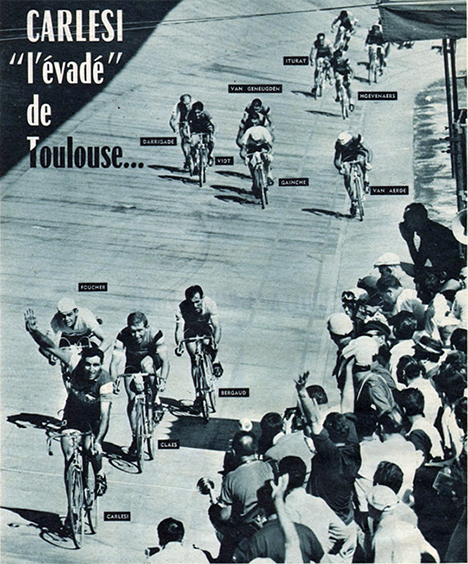 l'Irlandais Elliott tente à nouveau la fugue, sans succès car il est poursuivi par Darrigade et Cazala. Le même attaque encore vainement au km 179 de même qu'Abate et J. Groussard au km 184. Au km 190, Bergaud se détache et Claes le rejoint. Ils prennent 20" au km 194, 45" au km 196 et même 55" au km 198 mais les longues lignes droites des faubourgs les mettent dans la ligne de mire du peloton. Au km 199, ils n'ont plus que 30" "d'avance puis 20" au km 201. A 2 kilomètres du but, ils sont rattrapés par Carlesi et Foucher. Devant un peloton pressant, Carlesi entre en tête sur le vélodrome suivi de Claes, le peloton est à 6". L'Italien reste en tête jusqu'au bout en décollant progressivement ses adversaires et remporte sa deuxième victoire après Antibes. Van Aerde règle le sprint du peloton. Le groupe "Stab" est à 13'40".