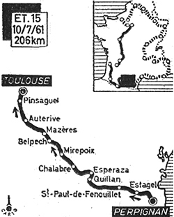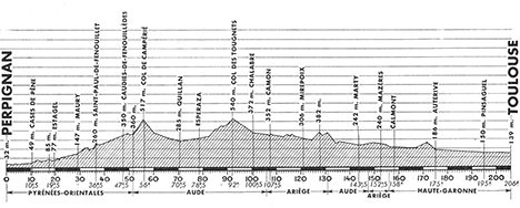 10h59 (Pyrénées-Orientales) : N117 Perpignan (km 0) - Peyrestortes (près de) (km 3.5) - Cases de Pène (km 10.5) - Estagel (km 19.5) - Maury (km 29) - Saint-Paul-de-Fenouillet (km 36.5) - Caudies-de-Fenouillèdes (km 47.5) - (Aude) : Lapradelle-Puilaurens (km 53.5) - Col Camperlé (km 56) - Carr. N117/N118 (km 59.5) - Belvianes-et-Cavirac (km 67.5) - Quillan (km 70.5-CV) - N118 Carr. D109 (km 72.5) - Bains (km 76.5) - Espéraza (km 78.5) - D12 Fa (km 81) - Bouvenac (km 85) - D12 Col des Tougnets (km 92) - D12 Carr. D16 (km 95.5) - Chalabre (km 100.5-CV) - D16 Sonnac-sur-l'Hers (km 103.5) - D16 Carr. D181 (km 105) - (Ariège) : D7 Camon (km 107.5) - D7 Carr. D28 (km 113) - La Bastide-de-Bousignac (près de) (km 116.5) - N625 Mirepoix (km 121-ravitaillement) - N625 Carr. D6 (km 123.5) - (Aude) : D625 Carr. D25 (près Plaigne) (km 134) - D25 Belpech (km 142) - Marty (km 143.5) - (Ariège) : Mazères (km 152.5-CV) - (Haute-Garonne) : D35 Calmont (km 158) - Cintegabelle (km 167) - D25 Carr. N20 (km 169) - N20 Auterive (km 175) - N20 Carr. D12 (km 181) - Le Vernet (km 186) - N20 Carr. D4 (km 192) - Pinsaguel (km 195) - N20 Carr. N125 (km 196) - Toulouse/Stade Vélodrome (km 206).