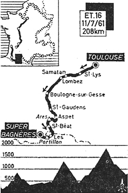 - Le peloton embraye immédiatement sur la montée finale vers Superbagnères. Après 3 km d'ascension, Laidlaw attaque sèchement et prend 25" mais ne peut soutenir ce rythme et se fait rejoindre à 10 km du but. La victoire ne se décide qu'à la flamme rouge et sous la tempête ! Massignan porte coup sur coup trois attaques et se détache. Anquetil et Gaul tentent de revenir sur l'Italien mais se font déborder par Carlesi qui "chipe" la bonification de 30".