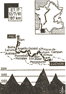 Dès la sortie de Luchon, les coureurs abordent le col de Peyresourde. Perez Frances attaque au km 4 suivi de Stablinski mais le peloton se reforme 2 kilomètres plus loin et la sélection s'opère par l'arrière. En vue du col (km 13.5), Massignan accélère et passe en tête avec 5" sur Junkermann et Gaul puis le reste des favoris. Dans la descente vers Arreau, le regroupement s'opère.
