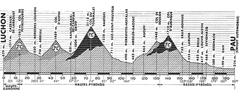 10h50 (Haute-Garonne) : Luchon (km 0) - N618 Carr. D51 (km 3.5) - Saint-Aventin (km 4) - Czeaux-de-Larboust (km 5.5) - Garin (km 7) - (Hautes-Pyrénées) : Col de Peyresourde (km 13.5-GPM2) - Estarvielle (près de) (km 20.5) - Aneran-Camors (km 21.5) - Bordères-Louron (km 26.5) - Arreau (km 31-CV) - Col d'Aspin (km 44-GPM2) - Espiadet/Carrière de marbre (km 49) - Payolle (km 50.5) - Pradille (km 53) - La Séoube (km 54) - Sainte-Marie-de-Campan (km 57-ravitaillement) - Gripp (km 61) - Col du Tourmalet (km 74-GPM1) - Barèges (km 85) - Luz-Saint-Sauveur (km 92) - N21 Pierrefitte-Nestalas (km 104-ravitaillement) - Argelès-Gazost (km 110-CV) - N618 Arras-en-Lavedan (km 113) - Aucun (km 119) - Marsous (km 120) - Arrens (km 122) - Col de Soulor (km 130) - (Basses-Pyrénées) : Col d'Aubisque (km 140-GPM1) - Eaux-Bonnes (km 152) - N134bis Laruns (km 158) - Bielle (km 165.5) - Louvie-Juzon (km 169) - Sevignacq-Mayracq (km 172.5) - Rebenacq (km 179) - Gan (km 187) - Pau/Circuit automobile (km 197).