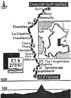 - Les échappés ne sont plus inquiétés et, aux 10 km, leur avance est de 4' sur le duo et 6' sur une meute bien calme. Sur le cours Fauriel à Saint-Étienne, Forestier ne laisse aucune chance à Stephan Lach. Everaert prend la 3ème place à 3'39" devant Zaboni et le peloton est réglé par Gainche à 4'09" devant Darrigade.
