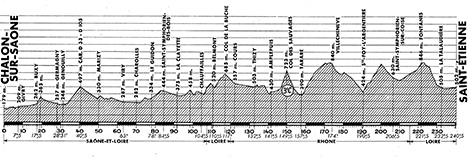 10h20 (Saône-et-Loire) : D69 Chalon-sur-Saône (km 0) - Givry (km 7.5) - N481 Saint-Désert (près de) (km 11.5) - Buxy (km 17.5) - N483 Montagny-lès-Buxy (km 20.5) - Germany (km 28) - Genouilly (km 31) - D33 Collonge-en-Charolais (km 34) - Carr. N80/D33 (km 43.5) - D33 Marizy (km 50) - Viry (km 63) - Charolles (km 70-CV) - N485 Changy-Tourny (km 75) - Le Guidon (km 78) - Saint-Symphorien-des-Bois (km 84.5) - La Clayette (km 91.5) - La Chapelle-sous-Dun (km 95.5) - Chauffailles (km 104.5-ravitaillement) - (Loire) : D31 Saint-Claude (km 109.5) - Belmont-de-la-Loire (km 110.5) - Col de la Buche (km 117) - (Rhône) : D8 Cours (km 122-CV) - Pont-Trambouze (km 125.5) - La Platière (km 129) - N504 Bourg-de-Thizy (km 130) - Thizy (km 132.5) - Saint-Jean-la-Bussière (km 137.5) - D8 Amplepuis (km 141.5) - Col des Sauvages (km 149.5-GPM3) - Tarare (km 157.5-CV) - D38 St-Marcel-l'Éclairé (près de) (km 161.5) - Croix du Signy (km 171.5) - D4 Villechenève (km174) - Les Auberges (km 178.5) - Chevaleron (km 184) - Saint-Laurent-de-Chamousset (km 186) - Sainte-Foy-l'Argentière (km 190.5-ravitaillement) - N89 Duerne (km 196.5) - D4 Chavanne (km 203.5) - Saint-Symphorien-sur-Coise (km 206.5) - Pont-Français (km 208.5) - (Loire) : D3 Grammond (km 220) - Fontanes (km 221.5) - La Fougère (km 226) - Grand Quartier (km 228) - La Talaudière (km 232.5) - Saint-Étienne/Cours Fauriel (km 240.5).