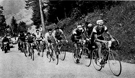 Dans le sévère col du Granier, 7 coureurs se lancent à la poursuite de Charly Gaul. On reconnait dans l'ordre Massignan, Carlesi, Dotto, Anquetil, Junkermann, Manzaneque, Mastrotto.