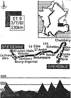 La chute de Charly Gaul dans la descente du Granier paraissait bénigne mais elle l'handicape sérieusement sur la fin d'étape. Il s'impose néanmoins en solitaire à Grenoble et reprend plus de deux minutes à Jacques Anquetil au C.G.