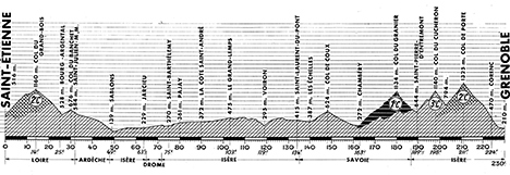 10h30 (Loire) : Saint-Étienne/Rue Robespierre (km 0) - N82 Planfoy (km 6.5) - Col du Grand-Bois (km 14-GPM2) - La Versanne (km 19) - Bourg-Argental (km 25) - N503 Col du Blanchet (km 30) - Saint-Julien Molin-Molette (km 32-CV) - (Ardèche) : D109 Félines (km 42.5) - N519 Serrières (km 48) - (Isère) : Sablons (km 49) - Chanas (km 52) - Bougé-Chambalud (km 59.5) - Jarcieu (km 63.5) - (Drôme) : Lapeyrouse-Mornay (km 68) - (Isère) : Beaurepaire d'Isère (km 73) - Saint-Barthélémy (km 75) - Les Roches (km 76) - D73 Pajay (km 80) - Penol (km 84) - La Côte-Saint-André (km 90-ravitaillement) - Gillonnay (km 93) - Saint-Hilaire-de-la-Côte (km 95) - La Frette (km 98) - Le Grand Lemps (km 103) - D73a Colombe (km 104.5) - N520 Apprieu (km 109.5) - La Murette (km 114) - Voiron (km 119-CV) - Croix-Bayard (km 122) - Saint-Étienne-de-Crossey (km 124.5) - Pont-de-Demay (km 128.5) - Saint-Joseph-de-Rivière (km 131) - Saint-Laurent-du-Pont (km 134) - Entre-Deux-Guiers (km 139.5) - (Savoie) : Les Échelles (km 140) - N6 Col de Couz (km 148) - Les Gros-Louis (km 150.5) - Saint-Thibaud-de-Couz (km 152) - Cognin (km 160) - Chambéry (km 163-ravitaillement) - D201 - D9 Saint-Badolph (km 168.5) - N512 Col du Granier (km 180-GPM1) - Entremont-le-Vieux (km 184.5) - (Isère) : Saint-Pierre d'Entremont (km 189.5) - Saint-Philibert (km 195.5) - Col du Cucheron (km 198-GPM3) - Saint-Pierre-de-Chartreuse (km 201.5) - N512 Col de Porte (km 211-GPM2) - Le-Sappey-en-Chartreuse (km 215.5) - Corenc (km 224) - La Tronche (km 228) - Grenoble/Stade Vélodrome (km 230).