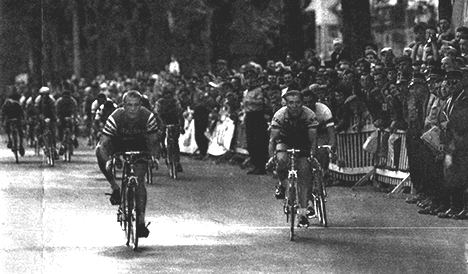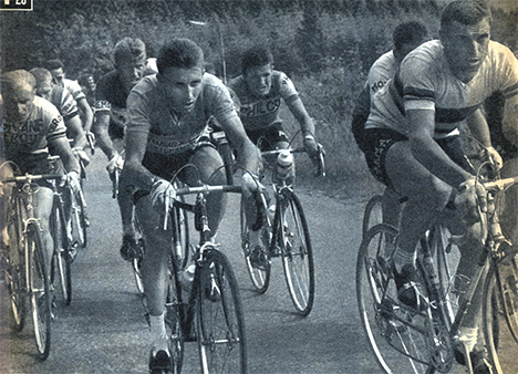 Le champion du monde en titre Rik Van Looy a déclenché la bataille et il conduit l'échappée, surveillé par Anquetil devant Darrigade et Altig derrière lui.