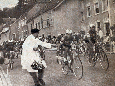 ... pendant ce temps, Poulidor, dont c'est la 1ère participation au Tour de France, mène le peloton de chasse. Gêné par sa fracture à l'auriculaire et le plâtre, l'addition sera lourde à Spa !