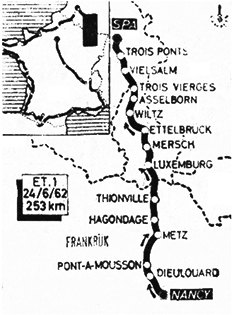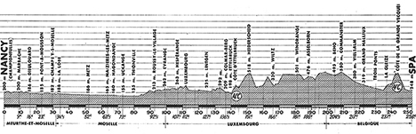 10h15 (Meurthe-et-Moselle) : Nancy - Champigneules (km 0) - N57 Frouard (km 4) - Pompey (km 5) - Marbache (km 9) - Belleville-sur-Meuse (km 12) - Dieulouard (km 16) - Blénod (km 20) - Pont-à-Mousson (km 23-CV) - Champey-sur-Moselle (km 29.5) - (Moselle) : La Lobe (km 34.5) - Corny-sur-Moselle (km 38.5) - Jouay-aux-Arches (km 42.5) - Montigny-lès-Metz (km 49.5) - Metz (km 52-CV) - N53 Saint-Rémy (km 57) - Maizières-lès-Metz (km 53.5) - Talange (km 66.5) - Hagondange (km 67.5) - Mondelange (km 68.5) - Richemont (km 70.5) - Uckange (km 73) - Maisons-Neuves (km 76) - Thionville (km 80-ravitaillement) - Manom (km 81) - Hettange Grande (km 86) - Roussy-le-Village (km 92.5) - Basse-Rentgen (carr. près de) (km 96) - Evrange (km 99) - (LUXEMBOURG) - Frisange (km 100) - D9 Hau (km 101) - Hesperange (km 107) - Luxembourg (km 112-CV) - N17 Walferdange (km 117.5) - Heisdorf (km 119.5) - Lorentwiller (km 122.5) - Lintgen (km 125) - Rollingen (km 127) - Mersch (km 128) - Roost (carr. près de) (km 133) - Colmar-Berg (km 136.5) - Schieren (km 138.5) - Ettelbruck (km 140) - N15 Côte d'Ettelbruck (km 142.5-GPM4) - Nieder (km 144.5) - Heiderscheid (km 151) - Buderscheid (km 160) - Wiltz (km 166-ravitaillement) - Carr. Fropeldange (km 168.5) - N12 - Hamiville (km 180) - Wincrange (km 181) - Asselborn (km 188) - Trois Vierges (km 192) - Wilverdange (km 194.5) - Schmiede (km 199.5) - (BELGIQUE) - N33 Beho (km 204.5) - Neuville (km 216) - N38 - N33 Vielsam (km 217) - Grand Halleux (km 222.5) - Trois-Ponts (km 230-CV) - La Gleize (km 237) - Stoutmont (km 240.5) - Côte de la Grande Vecquée (km 244-GPM4) - Winanplanche (km 249.5) - Marteau (km 251.5) - Spa / Av. Reine-Astrid (km 253).