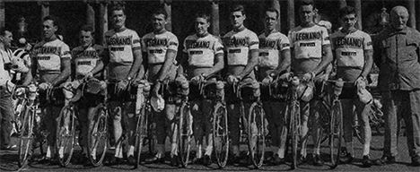 Battistini est absent au départ (santé) : 9 coureurs, tous Italiens. Massignan (8ème à gauche).