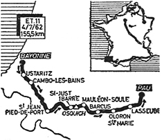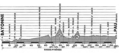 13h00 (Basses-Pyrénées) : Bayonne (km 0) - N132 Carr. D3 (km 2) - Ustaritz (km 10.5) - N132 Carr. D20 (km 12.5) - Cambo-les-Bains (km 17.5) - N168 Itxassou (km 22) - Louhossoa (km 26) - Bidarray (km 33) - Ossès (km 39) - Eyharce (km 40.5) - Uhart-Cize (km 50.5) - Saint-Jean Pied-de-Port (km 51.5-CV) - N133 Ispoure (km 52) - La Magdeleine (km 53.5) - Saint-Jean-le-Vieux (km 55.5) - Lacarre (km 59.5) - Ainhice-Mongelos (km 61.5) - Larceveau (km 67.5) - N618 Saint-Just Ibarre (km 73.5) - Osquich (km 77.5) - Col d'Osquich (km 79-GPM3) - Musculdy (km 84) - Odiarp (km 86.5) - Garindein (km 90) - Mauleon-Soule (km 91.5-ravitaillement) - D2 - D24 Cheraute (km 93.5) - Hoquy (km 97) - Côte de Barcus (km 99.5-GPM4) - Barcus (km 107) - Esquiule (km 113.5) - Oloron-Sainte-Marie (km 123-CV) - Gloës (km 125) - Lasseube (km 135) - Gan (km 145.5) - N134 Pau / circuit automobile (km 155.5).