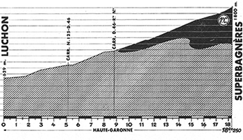 12h10 à 15h48 (Haute-Garonne) : Luchon / Allée des Bains (km 0) - N125 Carr. D46 (km 5.150) - D46 Carr. Rte Nle (km 8.950) - Superbagnères (km 18.250-GPM1).