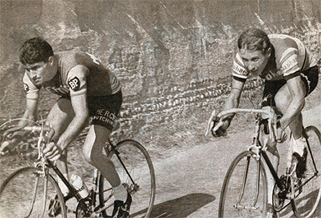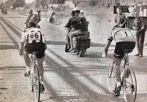 Km 38, Jacques Anquetil rejoint Poulidor parti 3 minutes avant lui.