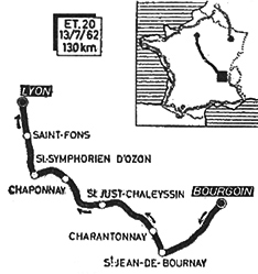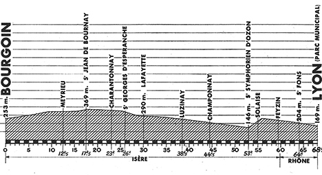 12h00 à 15h57 (Isère) : Bourgoin (km 0) - N522 Meyrieu (km 12.5) - Saint-Jean de Bournay (km 17.5-CV) - Carr. D53 (km 22) - D53 Charantonnay (km 23) - D53 Carr. N518 (km 24.5) - Saint-Georges d'Espéranche (km 26) - Lafayette (km 30) - D36 Saint-Just-Chaleyssin (près de) (km 35) - Luzinay (km 38.5) - D123b Chaponnay (km 44.5-ravitaillement) - D123b Carr. D123 (km 46.5) - D76 Saint-Symphorien d'Ozon (km 53) - Solaise (km 55) - D4d Carr. D4 (km 56.5) - D4 Feyzin (km 59.5) - (Rhône) : D12 Saint-Fons (km 64) - Lyon / stade municipal (km 68).