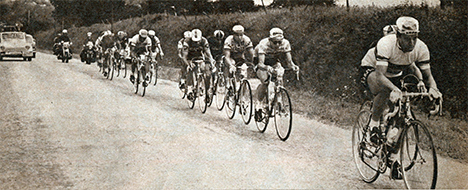 Van Looy a déclenché la bataille à plusieurs reprises. Ici, 12 hommes l'ont suivi à la poursuite des six échappés : Junkermann (caché), Ramsbottom, Wolfshohl, De Mulder, Poulidor, Hoevenaers, Elena, Simpson, Assirelli, Pauwels, Graczyk & Barale.