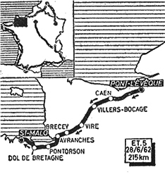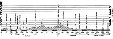 11h04 (Calvados) : Pont-l'Évêque (km 0) - N815 La Queue Devée (km 4) - La Haie Tondue (km 6) - Annebault (km 10) - La Forge (km 15) - Dozulé (km 18) - N815 Carr. D49 (km 20) - Goustranville (km 22.5) - Saint-Richer (km 25.5) - Saint-Samson (km 28) - Troarn (km 30) - Sannerville (km 32.5) - Mondeville (km 37) - Caen (km 43-CV) - N175 Venois (km 47) - Breteville-sur-Odon (km 48) - Verson (km 51) - Mondrainville (km 55) - Le Valtru (km 56.5) - Les Forges (km 58) - Noyers-Bocage (km 60) - Le Fecq (km 63) - Villers-Bocage (km 68) - La Poste (km 70.5) - N175 Carr. N177 (km 73) - N177 Carr. D54 (km 75) - Jurques (km 78) - La Hyguière (km 79) - Le Mesnil-Auzouf (km 83) - Montamy (km 84) - N177 Carr. D298 (km 88) - La Ferronnière (km 91) - Beaulieu (km 93) - La Papillonière (km 99.5) - Vire (km 103) - Côte du Bois-de-la-Haye (km 112-GPM4) - (Manche) : D76 - D55 Gathemo (km 114.5) - D39 Saint-Michel-de-Montjoie (km 118.5) - SaintPois (km 122) - Saint-Laurent-de-Cuves (km 126.5) - Brécey (km 131) - N811 Tirepied (km 138.5) - N811 Carr. N176 (km 144.5) - N176 Avranches (km 147-ravitaillement) - Le Quesnoy (km 150) - Pontaubault (km 154) - Précey (km 157.5) - Brée (km 164) - Pontorson (km 169) - (Ile-et-Vilaine) : Ville-Chérel (km 171) - Pont-au-Barbé (km 173) - Sains - Baguer-Pican (km 184) - Dol-de-Bretagne (km 188) - N155 Carr. D4 (km 189) - D4 Le Fédeuil (km 192) - La-Fresnais (près de) - Les-Quatre-Croix (km 197) - La Gouesnière (km 200.5) - D76 Saint-Méloir-des-Ondes (km 204.5) - D6 Carr. N55 (km 208) - N155 La Croix-Desilles (km 210) - Paramé (km 211.5) - Saint-Malo / Parc des Sports (km 215).