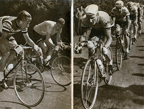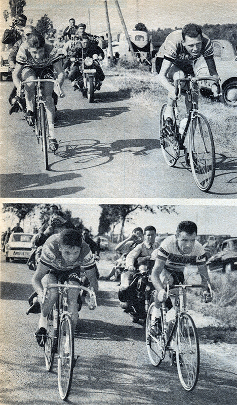 En haut, Jacques Anquetil rejoint Stolcker parti deux minutes avant lui - en bas, c'est au tour de Massignan d'être rattrapé.