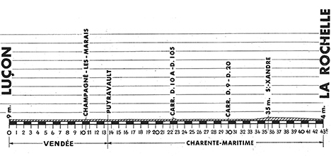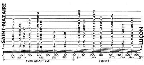 7h20 (Loire-Atlantique) : Saint-Nazaire (km 0) - N771 Montoir de Bretagne (près de) (km 6.5) - La Cordionnaie (km 8.5) - N771 Carr. N773 (km 9.5) - N771 Carr. D4 (km 11) - La Sensie (km 12) - Sem (km 14.5) - Le Sem (km 17) - La Tremblais (km 18.5) - Savenay (km 23.5) - D17 Carr. D90 (km 29.5) - Croissac (km 30.5) - La Croix-Mazel (km 33.5) - Saint-Étienne-de-Montluc (km 38.5) - D17 Carr. D101 (km 42.5) - D101 La Montagne (km 46.5 ) - Nantes (km 57.5-CV) - N137 Les Sorinières (65) - N178 Viais (km 69.5) - N137bis Geneston (km 77) - (Vendée) : La Noue Morin (km 82) - St-Philbert-de-Bouaine (km 85) - Rocheservière (km 90.5) - Les Lucs-sur-Boulogne (km 101.5) - Belleville-sur-Vie (km 109.5) - La Riborière (km 115) - La-Roche-sur-Yon (km 122.5-CV) - N148 - N746 La Barre (km 130) - Saint-Florent-des-Bois (km 134.5) - La Mainborgère (km 137.5) - Mareuil-sur-Lay (km 144.5) - Corps (près de) (km 149.5) - Luçon / Vélodrome stade Eugène Beaussire (km 155).