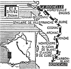 - Quelques escarmouches animent ensuite la course avec notamment Bahamontes, Barale & A. Desmet au km 51, Gentina et Novak au km 53 qui compteront 20" d'avance mais sans plus de succès. Au km 72, J.C. Lefebvre part seul. Le peloton laisse faire et il prend rapidement du champ : 25" au km 75, 1'25" au km 79, 3'10" au km 87 puis 3'30" à Cognac au km 92. Au km 94, une contre-attaque se met en place avec Huiart, Magnani, Daems, Benedetti & Mahé. Ils se rapprochent vite et reprennent Lefebvre au km 106 qui crève 3 km plus loin et doit rétrograder. Mahé passe le premier la côte d'Archiac au km 111.5 mais des coureurs sont revenus de l'arrière et le peloton n'est pas loin. Tout de regroupe au km 117.