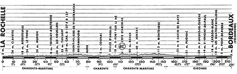 11h15 (Charente-Maritime) : La Rochelle (km 0) - D108 Périgny (km 2.5) - Saint-Rogatien (km 5.5) - Clavette (km 9.5) - D108 carr. D110 (km 11) - D108 Carr. D109 (km 12) - D108 Carr. D112 (km 16) - D112 Aigrefeuille d'Aunis (km 18.5) - N139 Puydrouard (km 21) - D112 Le Thou (km 23) - Landrais (km 27.5) - D112 Carr. D111 (km 29.5) - D117 Muron (km 32.5) - D112 Carr. D114 (km 43) - D114 Tonnay-Boutonne (km 45) - N739 Les Nouillers (km 51) - D127e Taillant (km 55.5) - Grandjean (km 58) - D127e Carr. D127 (km 59) - D127 Carr. D124 (km 60) - Saint-Hilaire de Villefranche (km 66) - N731 Carr. D129 (km 69.5) - Brizambourg (km 71) - Burie (km 79-CV) - (Charente) : N731 Carr. D85 (km 86) - Cognac (km 91.5-CV) - Salles d'Angles (km 100) - Saint-Fort-sur-le-Né (km 105) - (Charente-Maritime) : Cierzac (près de) (km 106) - Archiac (km 111.5-GPM4) - N699 Arthenac (km 112.5) - Réaux (km 118.5) - Jonzac (km 125.5-CV) - D19 Carr. D253 (km 131.5) - Villexavier (km 135.5) - Chartuzac (km 139.5) - Montendre (km 145.5-ravitaillement) - D145 Carr. D152 (km 151) - D152 Carr. D157 (km 155) - (Gironde) : D23 Saint-Savin-de-Blaye (km 163.5) - D23 Carr. D135 (km 167.5) - Saint-Urbain (km 169.5) - Pugnac (km 172) - N137 Carr. D142 (km 177) - N137 Carr. N10 (km 182) - N10 Saint-André-de-Cubzac (km 183.5) - Saint-Vincent-de-Paul (km 188.5) - Marquet (km 191.5) - N10 carr. D13 (km 192.5) - Carbon-Blanc (km 196) - Les Quatre Pavillons (km 200) - Bordeaux / Pont de Pierre (km 205) - Bordeaux / Stade vélodrome (km 214).