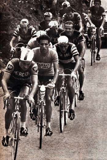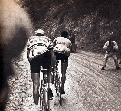Poulidor en jambes dans le Grand St-Bernard accélère et dynamite le peloton.