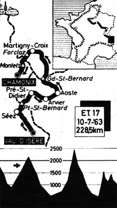 - Anquetil est le plus fort dans cette dernière semaine et à Chamonix il remporte l'étape devant Bahamontes. La bonification attribuée lui fait prendre le maillot jaune. Van Looy règle un groupe de 5 poursuivants à 18". Poulidor termine 17ème à 8'23".