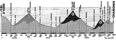 8h50 (Savoie) : Val d'Isère (km 0) - Barrage de Tignes (km 6.5) - Pont de la Balme (km 10.5) - Ste-Foy Tarentaise (km 18.5) - Viclaire (km 21.5) - Séez (km 27.5) - Col du Petit-St-Bernard (km 55.5-GPM2) - (ITALIE) - La Thuile (km 68.5) - La Balme (km 62.5) - Pré-St-Didier (km 78.5) - Morgex (km 82) - Avise (près de) (km 94.5) - Arvier / Souv. Maurice Garin (km 97) - Villeneuve (km 100.5) - Sarre (km 104.5) - Aoste (km 110.5-ravitaillement) - Variney (km 116.5) - Gignod (km 119.5) - Étroubles (km 128.5) - Saint-Oyen (km 130.5) - Saint-Rémy (près de) (km 134.5) - (SUISSE) - Col du Grand-St-Bernard (km 145.5-GPM1) - Bourg-St-Pierre (km 158.5) - Liddes (km 164.5) - Orsières (km 172.5) - Sembrancher (km 178.5) - Bovernier (km 184) - Les Valettes (km 185) - Martigny-Croix (km 188.5-ravitaillement) - Col de la Forclaz (km 201.5-GPM1) - Trient (km 205) - Le Châtelard (km 210.5) - (FRANCE) - (Haute-Savoie) : Vallorcine (km 213) - Col des Montets (km 217-GPM3) - Trélechamp (km 218) - Argentière (km 220.5) - Les Tines (km 224.5) - Les Praz (km 226.5) - Chamonix / Av. de la patinoire (km 228.5).