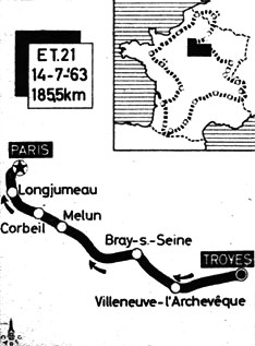 11h50 (Aube) : Troyes (km 0) - La Grange-au-Rez (km 8) - Fontvannes (km 13) - Estissac (km 18) - Villemaur-sur-Vanne (km 24) - St-Benoist-sur-Vanne (km 29) - Vulaines (km 33) - (Yonne) : Villeneuve-L'Archevêque (km 38) - Molinons (km 40) - Lailly (km 41) - La Postolle (km 50.5) - Thorigny-sur-Oreuse (km 54) - Barrault (km 59.5) - Servins (km 60.5) - Pailly (km 64) - Plessis-St-Jean (km 65) - Compigny (km 68) - (Seine-et-Marne) : Montigny-le-Guesdier (km 70.5) - Bray-sur-Seine (km 74.5) - Mouy-sur-Seine (km 75.5) - Cutrelles (km 83) - Dontilly (km 85.5) - Villeneuve-les-Bordes (km 92) - Les Ecrennes (km 106) - Le Châtelet-en-Brie (km 111.5) - Massoury (km 115.5) - Le Buisson (km 118.5) - Chartrettes (km 119.5) - Melun (km 126-ravitaillement) - Cesson (km 131) - Nandy (près de) (km 134) - (Seine-et-Oise) : Saintry-sur-Seine (km 139.5) - Corbeil-Essonnes (km 143.5) - Courcouronnes (km 148) - Ste-Geneviève-des-Bois (km 154.5) - Morsang-sur-Orge (km 157) - Villemoisson (km 158) - Épinay-sur-Orge (km 159) - Longjumeau (km 163) - Champlan (km 165) - Palaiseau (km 167) - Igny (km 170.5) - Bièvres (km 172.5) - (Seine) : Petit-Clamart (km 175.5) - (Seine-et-Oise) : Bruyères-de-Sèvres (km 180.5) - Sèvres (km 181.5) - (Seine) : Boulogne-Billancourt (km 183.5) - Paris / Parc des Princes (km 185.5).