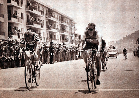 - A 18 km du but, Van Tongerloo provoque la décision. G. Desmet 1, Altig, Janssen, Genet, Nijdam & Wright se portent à sa hauteur et le groupe prend ses aises : 1'05" au km 183, écart qu'ils conserveront pratiquement jusqu'à Hyères (1'02"). Nijdam démarre aux 600 mètres. Il est contré par Altig lequel est finalement débordé par Jan Janssen le maillot vert.