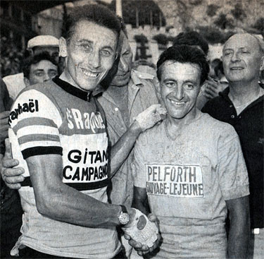 - Le peloton aborde la sévère côte de Gassin (km 127) franchie en premier par Bahamontes puis la chasse aux canettes continue. A Cogolin (km 122), Manzaneque tombe et rend responsable Taccone. Les coureurs médusés assistent à un pugilat entre les deux coureurs, Manzaneque s'était déjà fait défavorablement remarquer avec un officiel au départ.