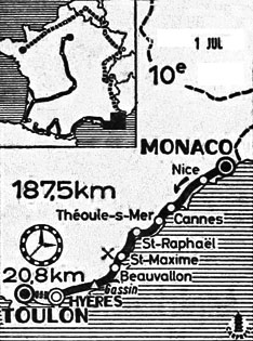 - Au km 3, Le Menn attaque avec dans son sillage Pacheco & Poulidor. Ils prendront 10" avant d'être repris à Eze Village, en haut de la côte. Le Menn remet ça juste après avec cette fois-ci Segu & Lefebvre et le trio prend 10" avec le même résultat. Ils sont repris à Nice (km 16) et la promenade commence, pas seulement celle des Anglais... signalons juste une escarmouche de Beheyt au km 72. Il est successivement rejoint par Otano et Lefebvre puis par De Roo, Genet, Vyncke, J. Groussard enfin par Segu et Janssen et pour finir par le peloton au km 78. Une tentative de Milesi et Denson au sortir du ravitaillement de Ste Maxime (km 113) provoquera une cassure du peloton jusqu'à Beauval (km 119) où Darrigade remporte la prime "Henri-Desgrange".