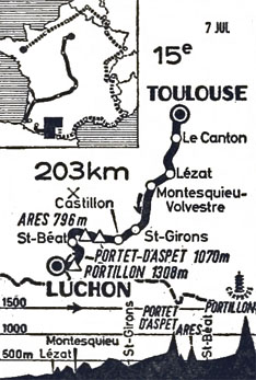 - Jamais depuis la Côte d'Azur, le départ n'a été aussi calme, quiétude à peine troublée par un démarrage de Genet au km 40. L'action d'Anglade, soutenue par Ferrer (km 42) et bientôt épaulée par Hernandez et Milesi provoque une vive accélération (km 44). De même l'initiative de treize hommes au km 52: Epaud, Zimmermann, Mattio, Haast, Graczyk, Kunde, Claes, Anglade, R. Altig, Hamon, Barrutia, Vyncke, Janssen réanime le peloton jusqu'au km 55 puis, plus rien de bien sérieux jusqu'au col de Portet-d'Aspet. Poulidor tâte le terrain et ses rivaux en accélérant judicieusement mais il préfére attendre son heure. Au sommet (km 127), les positions sont les suivantes : Jimenez en tête, à 10" Bahamontes, à 25" le peloton, dans cet ordre: Poulidor, Anglade, Galera, Manzaneque, Haast, R. Altig, Zimmermann, Janssen, Otano. Simpson, Kunde, Gabica, Adorni, Georges Groussard, etc. Anquetil, quant à lui, végète dans les dernières positions du peloton et ne semble pas très fringant. A 2' passe Sels, accompagné par Denson et par Beheyt victime d'une crevaison.