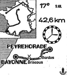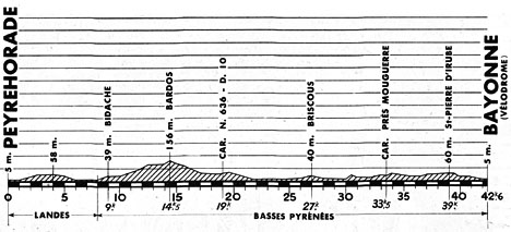 12h50 (Landes) : Peyrehorade (km 0) - (Basses-Pyrénées) : Bidache (km 9) - Bardos (km 14.5) - Briscous (km 27) - Mouguerre (carref.près de) (km 33.5) - Saint-Pierre-d'Irube (km 39) - Bayonne / vélodrome (km 42.6).