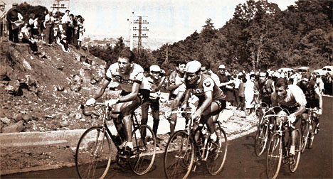 Dès le pied du Puy-de-Dôme, les cadors sont en tête. On voit ici Adorni devant Poulidor et Bahamontes (masqué) puis Anquetil suivi de Jimenez et Gabica.