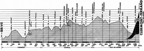 10h00 (Corrèze) : Brive (km 0) - Palisse (km 0.5) - Lanteuil (km 10) - Beynat (km 17) - Les 4-Routes (km 23) - Saint-Chamant (km 35) - Argentat (km 41) - Côte de Saint-Privat (km 48-GPM3) - La Maison neuve (km 51) - Saint-Privat (km 59) - Saint-Julien-aux-Bois (km 63) - (Cantal) : Fléaux (km 72) - Bouvals (km 76) - Ally (km 81) - Côte du Pont d'Auze (km 86.5) - Trebiac (km 90.5) - Mauriac(km 92-ravitaillement) - Le Vigean (km 93.5) - Pons (km 101) - Moussages (km 107.5) - Côte des Bessonies (km 114-GPM4) - Trizac (km 115) - Col de La Beyssère (km 117) - Valette (km 122) - Riom-es-Montagnes (km 128) - Chapsal (km 134) - Saint-Amandin (km 139) - Condat-en-Feniers (km 146) - La Chapelle (km 149) - (Puy de Dôme) : Egliseneuve-D'Entraigues (km 157-ravitaillement) - Pont de Clamouze (km 165) - Besse-en-Chandesse (km 174) - Saint-Victor-Larivière (km 181) - Bessolles (km 182) - Murol (km 180) - Saignes (km 192) - Col de La Ventouse (km 203) - Theix (km 209) - Varennes (km 212) - Ceyrat (km 217) - Beaumont (près de) (km 220) - Clermont-Ferrand (km 223) - La Baraque (km 231) - Puy-de-Dôme (km 237.5-GPM1).