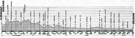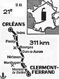 7h26 (Puy-de-Dôme) : Clermont-Ferrand (km 0) - Cebazat(km 3.5) - Blanzat (km 5.5) - Argnat (km 10) - Le Cratère (km 14.5-GPM4) - Moulet-Marcenat (km 18) - Paugnat (km 20) - Charbonnières-les-Varennes (km 22.5) - Les 4-Routes (km 25.5) - Manzat (km 33.5) - La Vareille (km 38) - La Montgie (km 45.5) - Saint-Gervai-d'Auvergne (km 52.5) - Pionsat (km 68.5) - Le Marturet (km 71.5) - (Allier) : Marcillat-en-Combraille (km 76.5) - Le Teray (km 81.5) - Villebret (km 89.5) - Montluçon (km 98.5-ravitaillement) - Desertines (km 101.5) - Marmignolles (km 102.5) - Croix de Fragne (km 109) - Louroux-Hodement (km 118.5) - Hérisson (km 124.5) - Saint-Caprais (km 130.5) - Le Brethon (km 134.5) - Les Loges (Carref. près de) (km 139) - Saint-Bonnet-Tronçais (km 145) - Ainay-le-Château (km 151) - (Cher) - Carr. Laugère (km 154) - Les Perons (km 157) - Le Pondy (km 162) - Thaumiers (km 164) - Dun-sur-Auron (km 174) - Saint-Just (km 187.5) - 201,5 Bourges (km 201.5-ravitaillement) - Asnières (près de) (km 205.5) - Vasselay (km 209.5) - Les Roches (km 214) - Les Rousseaux (km 216.5) - Mery-ès-Bois (km 228) - Presly (km 236.5) - Menestreol-s-Sauldre (km 244.5) - Sainte-Montaine (km 249.5) - Clemont-s-Sauldre (km 258.5) - Mons-de-Mars (km 266) - (Loiret) : Isdes (km 271.5) - Vannes-s-Cosson (km 277.5) - Le Gué Robert (km 284.5) - Le Cercle (km 287) - Le Bruel (km 294) - Sandillon (km 298) - Saint-Jean-le-Blanc (km 308) - Orléans / circ. du Champ de Mars (km 311).