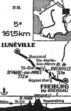 - En haut de Ribeauvillé (km 86.5) Altig passe le premier au sommet. Galera est à 35" et l'avant-garde du peloton est pointée à 1'. Les lâchés sont de plus en plus nombreux et le maillot jaune Vandekerkhove est lui-même décroché en compagnie de Cazala, Van Aerde et de dix autres coureurs. Dans la descente, Mahé fait une mauvaise chute et devra abandonner. Galera finit par compléter le groupe de tête au km 92. Au ravitaillement de Kaysersberg (km 101), les cinq précédent de 2'25" le peloton, fort d'une soixantaine d'hommes. Quelques velleités encore : Pambianco et Hovenaers bloquées respectivement par Elliott et Novak puis l'accalmie revient dans le peloton, ce qui permet le retour du maillot jaune au km 108 et aussi l'accroissement de l'écart : 4'50" au passage de la frontière franco-allemande (km 130), 5'30" à 10 km du but.