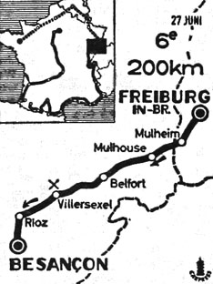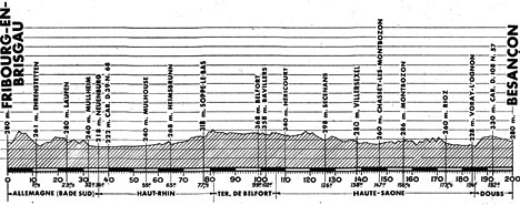 11h26 (ALLEMAGNE) - (Bade-Sud) : Fribourg-en-Brisgau (km 0) - Merzhausen (km 1) - Au (km 2.5) - Wittnau (km 4.5) - Solden (km 5.5) - Bollschweil (km 8.5) - Ehrenstetten (km 11.5) - Staufen (km 15.5) - Grunern (km 17) - Ballrechten (km 19) - Sulzburg (près de) (km 21.5) - Laufen (km 23.5) - Britzingen (km 26) - Zimzingen (km 28) - Mullheim (km 32) - Neuenburg (km 36) - (FRANCE) - (Haut-Rhin) : Chalampe (près de) (km 38) - Grunhutte (km 45) - Ile Napoléon (km 50) - Riedisheim (km 52) - Mulhouse (km 55) - Morschwiller-le-Bas (km 61.5) - Heimsbrunn (km 65) - Pont d'Aspach (km 72) - Soppe-le-Bas (km 77.5) - (Territoire de Belfort) : La Chapelle-sous-Rougemoftt (km 83.5) - Roppe (km 92.5) - Belfort (km 99) - Bavilliers (km 102) - Argiesans (km 104) - (Haute-Saône) : Héricourt (km 110) - Couthenans (km 113) - Champey (km 116.5) - Saulnot-et-Malval (km 121) - Crevans (km 125.5) - Sécenans (km 126) - Villechevreux-et-Courbenans (km 130) - Saint-Ferjeux (km 131.5) - Villergent (km 133.5) - Villers-la-Ville (km 135.5) - Villersexel (km 138) - Autrey-le-Vay (km 142) - Esprels (km 144) - Chassey-lès-Montbozon (km 147) - Tressandans (près de) (km 148.5) - Thieffrans (km 149.5) - Montbozon (km 156.5) - Loulans-les-Forges (km 161.5) - Marloz (km 167.5) - Anthon (km 169.5) - Rioz (km 173.5) - Breurey (km 179) - Villers-le-Temple (km 180.5) - Voray-sur-L'Ognon (km 184) - (Doubs) :Valentin (km 192) - Ecole (km 193) - Pirey (km 194.5) - Besançon / stade vélodrome (km 200).