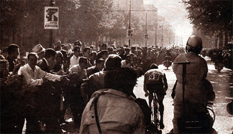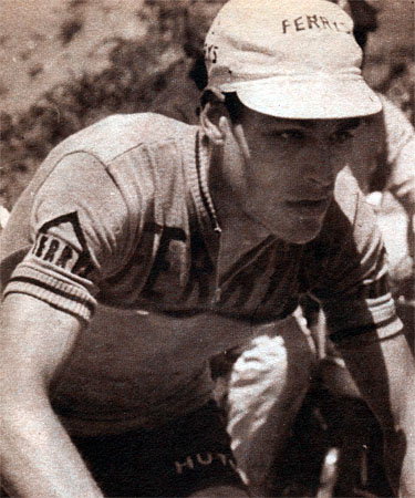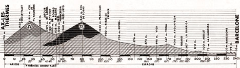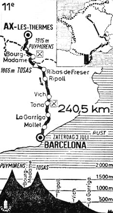 - Il poursuit son effort après le col et entre en Espagne avec 6'30" d'avance puis 7'20" au pied du long col de Tosas. Dans la montée il possèdera jusqu'à 9'20" sur le peloton. Derrière quelques contre-attaques de De Rosso et d'Elorza, pui une de Gimondi lui feront perdre un peu de temps. Au sommet du col de Tosas (km 80.5), il passe avec 8'30" d'avance sur le peloton réglé au sommet par Van Looy.