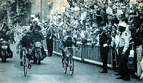 - En tête de course, dans la montée, Momene et Van Dongen sont les premiers distancés. Mastrotto, Verhaegen également doivent laisser filer Gilbert Desmet 1 et Giuseppe Fezzardi qui passent en tête au sommet (km 161), à 30" Mastrotto et Verhaegen, à 1'20" Momene et Van Dongen et à 2'15" le peloton emmené par Esteban Martin. Les leaders ne sont plus inquiétés et il faudra la photo pour départager Desmet et Fezzardi. L'Italien de Molteni l'emporte. Le peloton est réglé par Jan Janssen 3'16" plus tard.